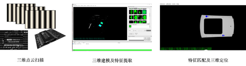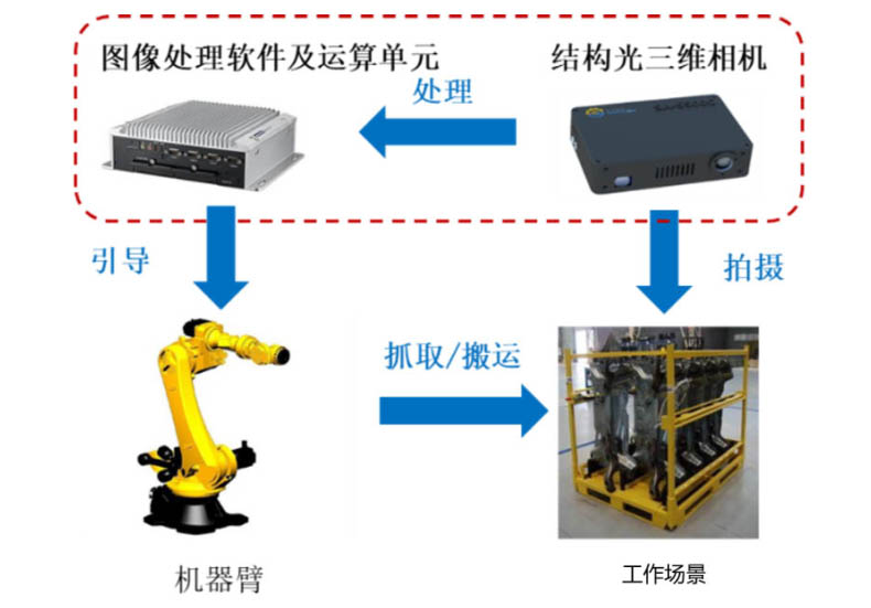 三維物體識別、定位及機(jī)器人引導(dǎo)視覺系統(tǒng)主要由高精度三維圖像傳感器和智能三維圖像處理及機(jī)器人引導(dǎo)軟件組成。通過3D結(jié)構(gòu)光掃描,快速獲取工作場景的三維圖像信息,并通過與圖像庫中的模型進(jìn)行對比,自動識別工作場景中的零件類型,及其三維空間內(nèi)的位置及姿態(tài)信息,從而實(shí)時引導(dǎo)機(jī)器人調(diào)整位置及姿態(tài),準(zhǔn)確完成相應(yīng)工作。