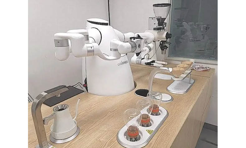 智能咖啡設(shè)備(大白機(jī)器人)也被安置于媒體中心提供服務(wù)。智能咖啡設(shè)備其實(shí)是一個(gè)雙臂協(xié)作機(jī)器人。據(jù)了解,大白機(jī)器人由兩條六軸協(xié)作式機(jī)械臂組成,左右機(jī)械臂可以同時(shí)開工,能精準(zhǔn)執(zhí)行各種不同的動(dòng)作??赏瓿扇《?、稱重、取水、上水、沖泡等一系列咖啡制作工藝。大白機(jī)器人復(fù)刻了大師級(jí)手沖咖啡的流程,能像咖啡大師一樣在進(jìn)行拉花工藝展示的同時(shí)保證每一杯都能達(dá)到最好效果。只需4分鐘,沖咖啡“大師”大白機(jī)器人就可制作一杯醇香的咖啡。