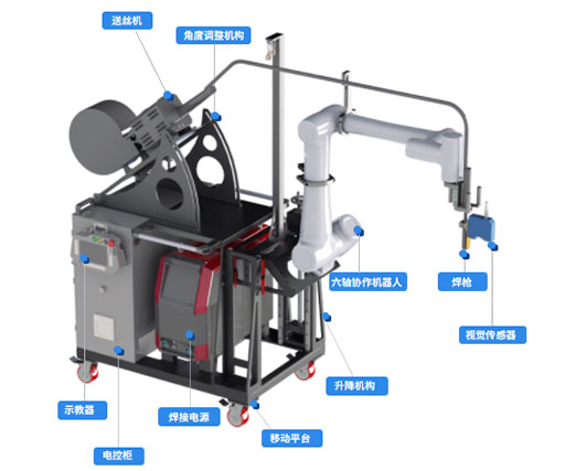 智能移動焊接平臺主要機構包含六軸協作機器人、焊接電源、送絲機、焊槍、移動平臺、升降機構、角度調整機構、視覺傳感器、電控柜和手持盒等。其中六軸協作機器人可以通過拖拽的方式,完成軌跡示教;移動平臺采用大尺寸萬向輪以及采用輕量化設計,可以有效提升小車的越障能力,輕松便捷的移動;升降機構可以提升機器人的有效焊接區(qū)域,實現更高焊接位置覆蓋。視覺傳感器可實現自動掃描尋跡,引導機器人完成精準焊接。